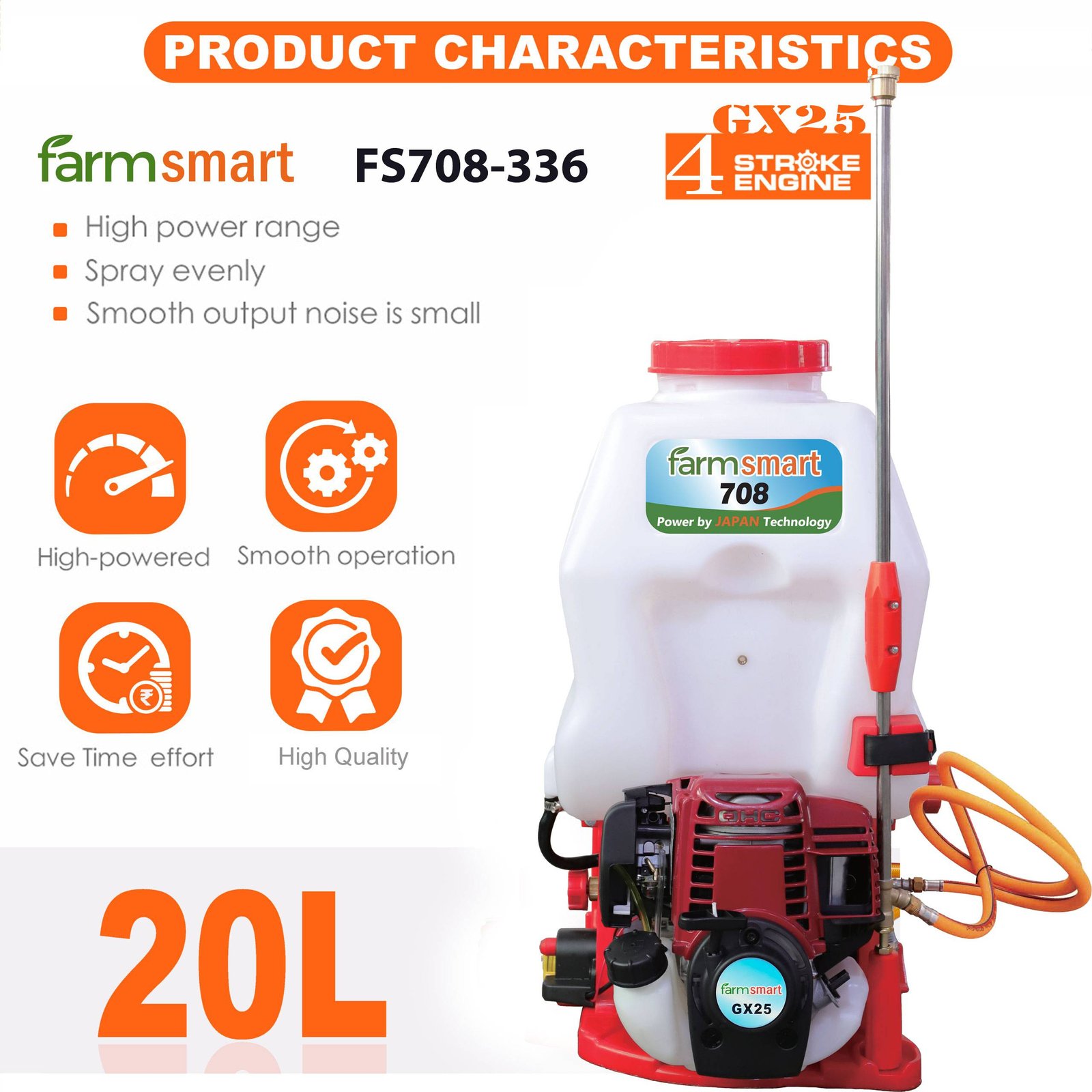 The FarmSmart Power Sprayer 20 Litre White – FS708-336 is a premium-quality agricultural sprayer, widely used in farming, gardening, horticulture, plantations, and forestry. Designed for high-pressure spraying, it efficiently applies insecticides and pesticides over large areas. It comes equipped with two spray guns for versatile use, a durable brass pump, and a diaphragm-type carburetor. Powered by a 4-stroke forced air-cooled petrol engine with an easy recoil starter, this sprayer ensures reliable performance and user-friendly operation.