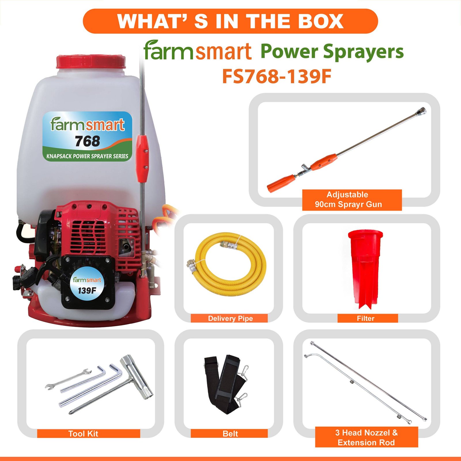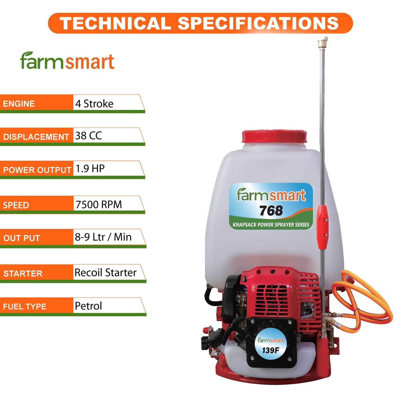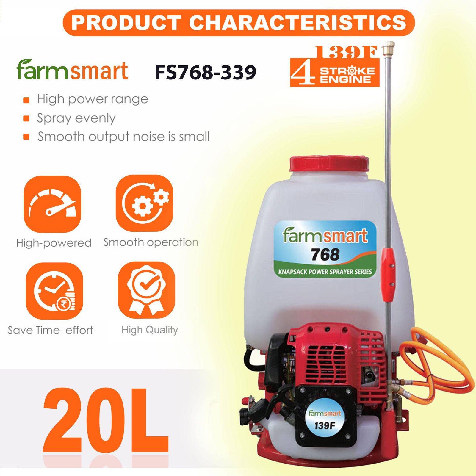 The FarmSmart Power Sprayer 20 Litre White – FS768-339 is a premium-quality agricultural sprayer, widely used in farming, gardening, horticulture, plantations, and forestry. Designed for high-pressure spraying, it efficiently applies insecticides and pesticides over large areas. It comes equipped with two spray guns for versatile use, a durable brass pump, and a diaphragm-type carburetor. Powered by a 4-stroke forced air-cooled petrol engine with an easy recoil starter, this sprayer ensures reliable performance and user-friendly operation.